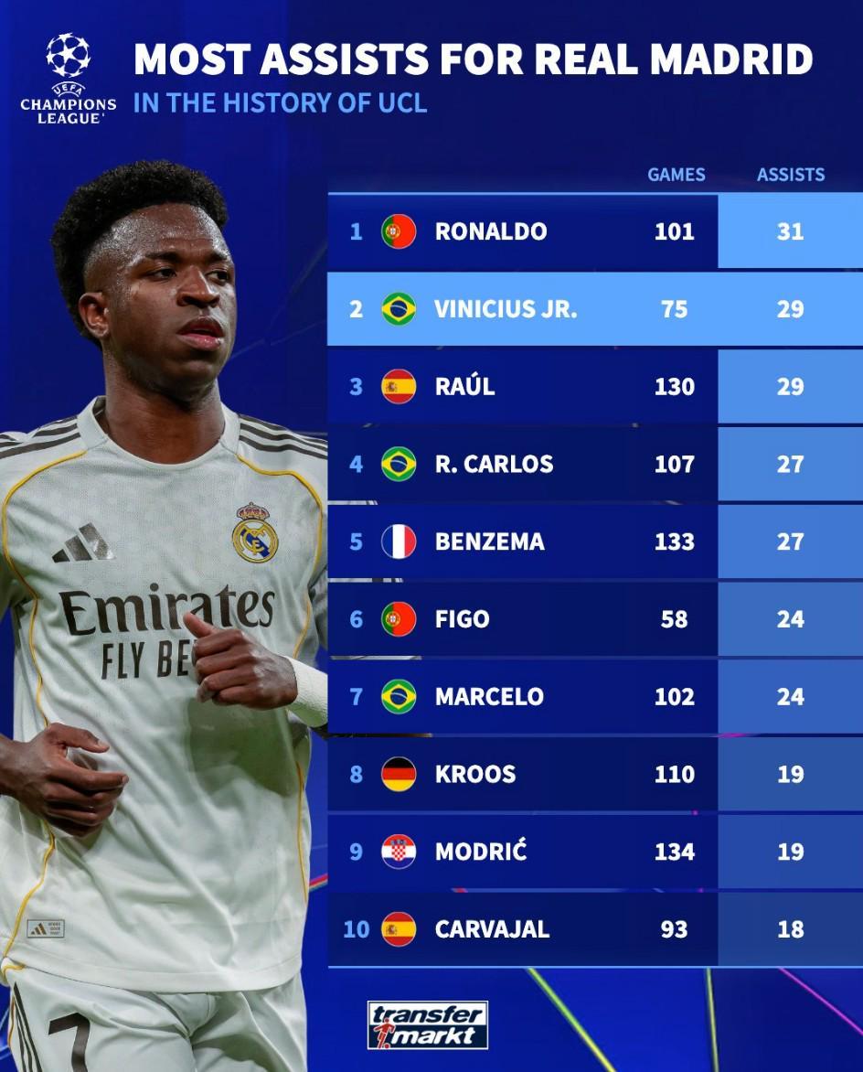 北京时间1月22日,在维尼修斯用两传一射帮助皇家马德里主场6-1大胜摩纳哥之后,德转统计出了银河战舰队史欧冠助攻数排名前10的球员,维尼修斯以29次助攻追平劳尔并列第二,距离排名第一的C罗只差2次助攻。